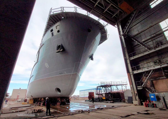 В Ярославской области на судостроительном заводе «Вымпел» (входит в ОСК) состоялась выкатка из эллинга на открытый стапель морского транспорта вооружения проекта 20360М «Владимир Пялов».