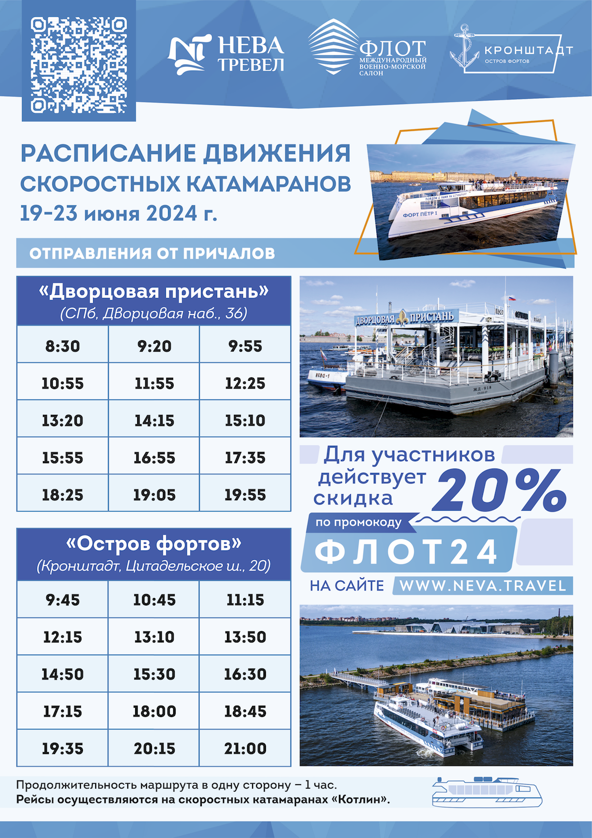 Группа компаний «Нева Тревел» предлагает Вам добраться до места проведения Международного военно-морского салона «ФЛОТ-2024» по живописному водному маршруту на комфортабельном катамаране со скидкой 20%!